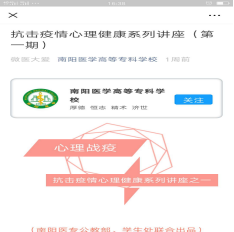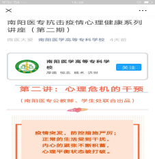 4.心理“战役”讲座不断更新。人文教研室的几位心理专业专兼职教师,利用课余时间加班加点录制心理健康专题讲座三期,通过学校官微、系部学生群等平台发送给学生,浏览量累计达到4000余人次,有效指导学生舒缓心理压力,增强战胜疫情的信心和决心,以饱满的热情投入到学习和生活中来。