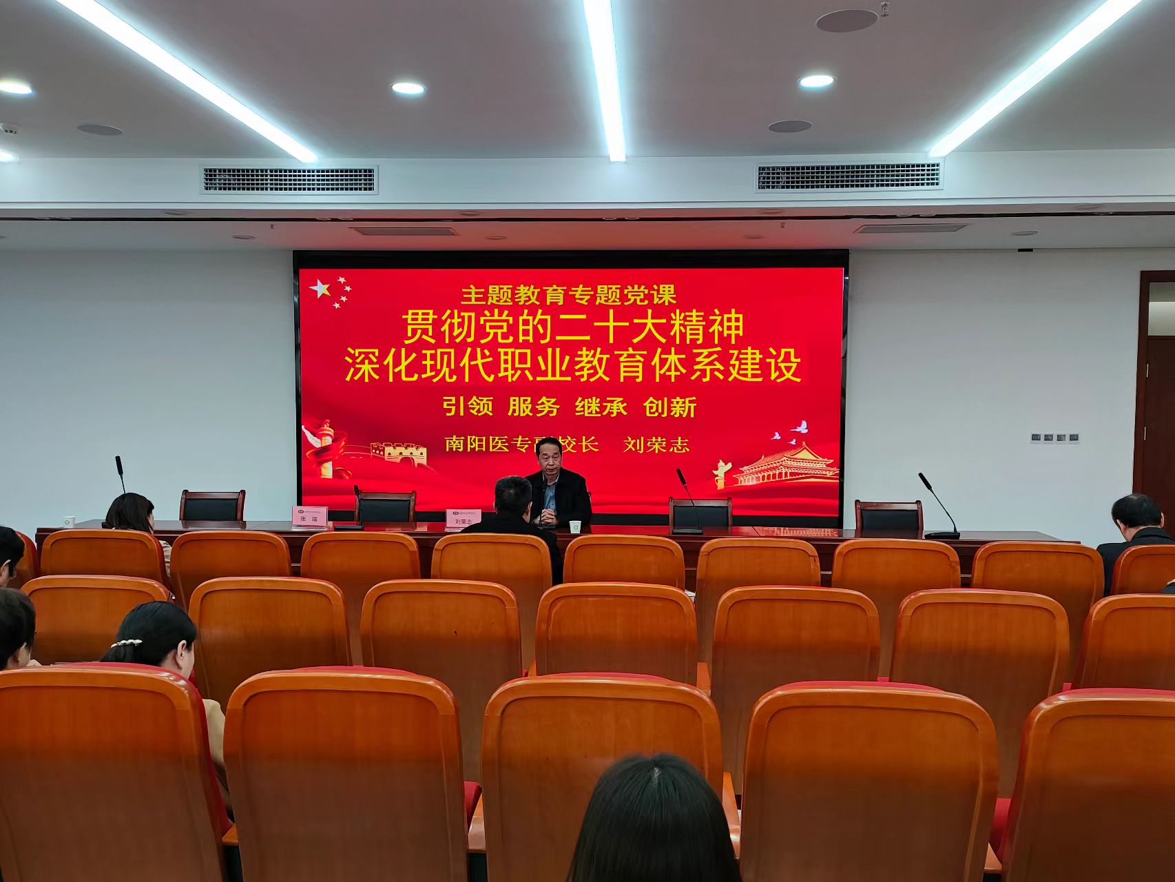 为深入学习贯彻习近平新时代中国特色社会主义思想,引导广大党员干部、教师学思想、强党性、重实践、建新功,在工作岗位上不断创新。11月22日下午,在仲景文化中心701会议室,校党委委员、副校长刘荣志以《贯彻党的二十大精神,深化现代职业教育体系建设》为题,为太阳成集团tyc33455ccww全体教师上了一堂党课。
