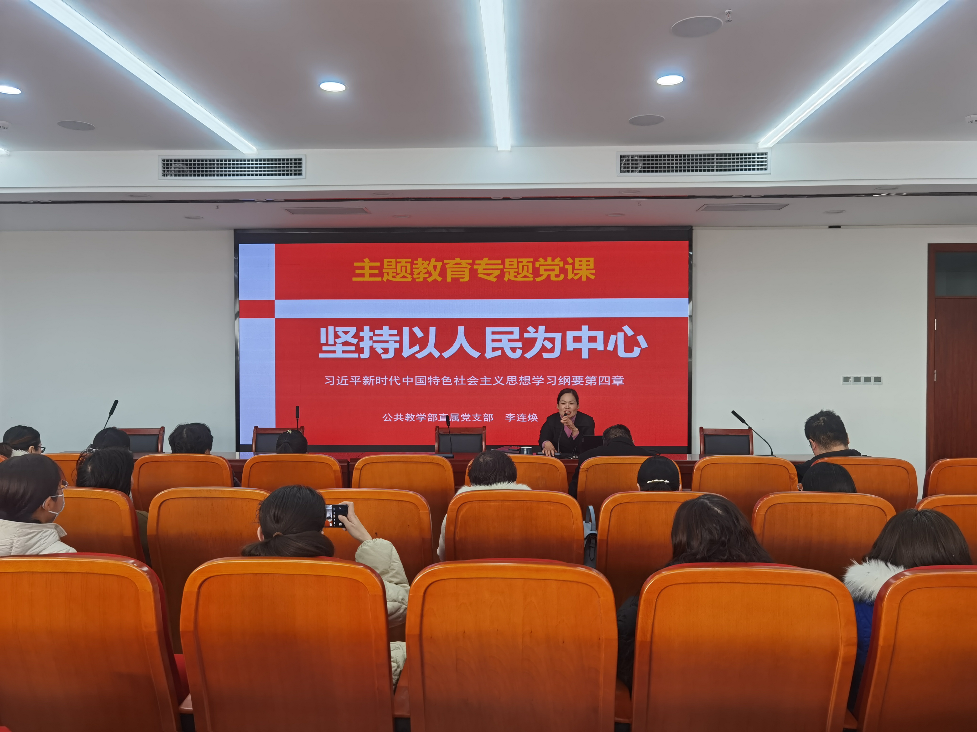 2023年12月6日下午,在仲景文化中心七楼会议室,太阳成集团tyc33455ccww直属党支部书记李连焕以《坚持以人民为中心》为题,为太阳成集团tyc33455ccww全体教职工上了一堂精彩的专题党课。