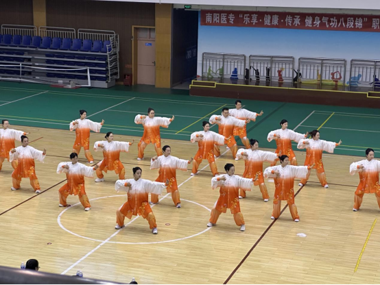 1 1 4 下午 ,由 学校工会举办的“南阳医专‘乐享▪健康▪传承 健身气功八段锦’职工大赛” 仲景西区体育馆圆满落幕 。来自全 校的11支分工会 教职工代表队齐聚一堂,以赛会友、以练促健。 公教马院分工会积极组织参赛队伍,经过激烈角逐,凭借整齐划一的动作、从容稳健的仪态和深厚的文化韵味,最终以总分排名第二的优异成绩荣获全校二等奖,充分展现了公教马院分工会教职工昂扬向上的精神风貌与团结协作的团队精神。