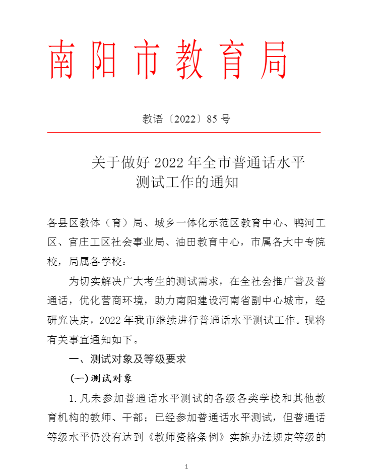 南阳市教育局 教语〔2022〕85号 《关于做好2022年全市普通话水平测试工作的通知》