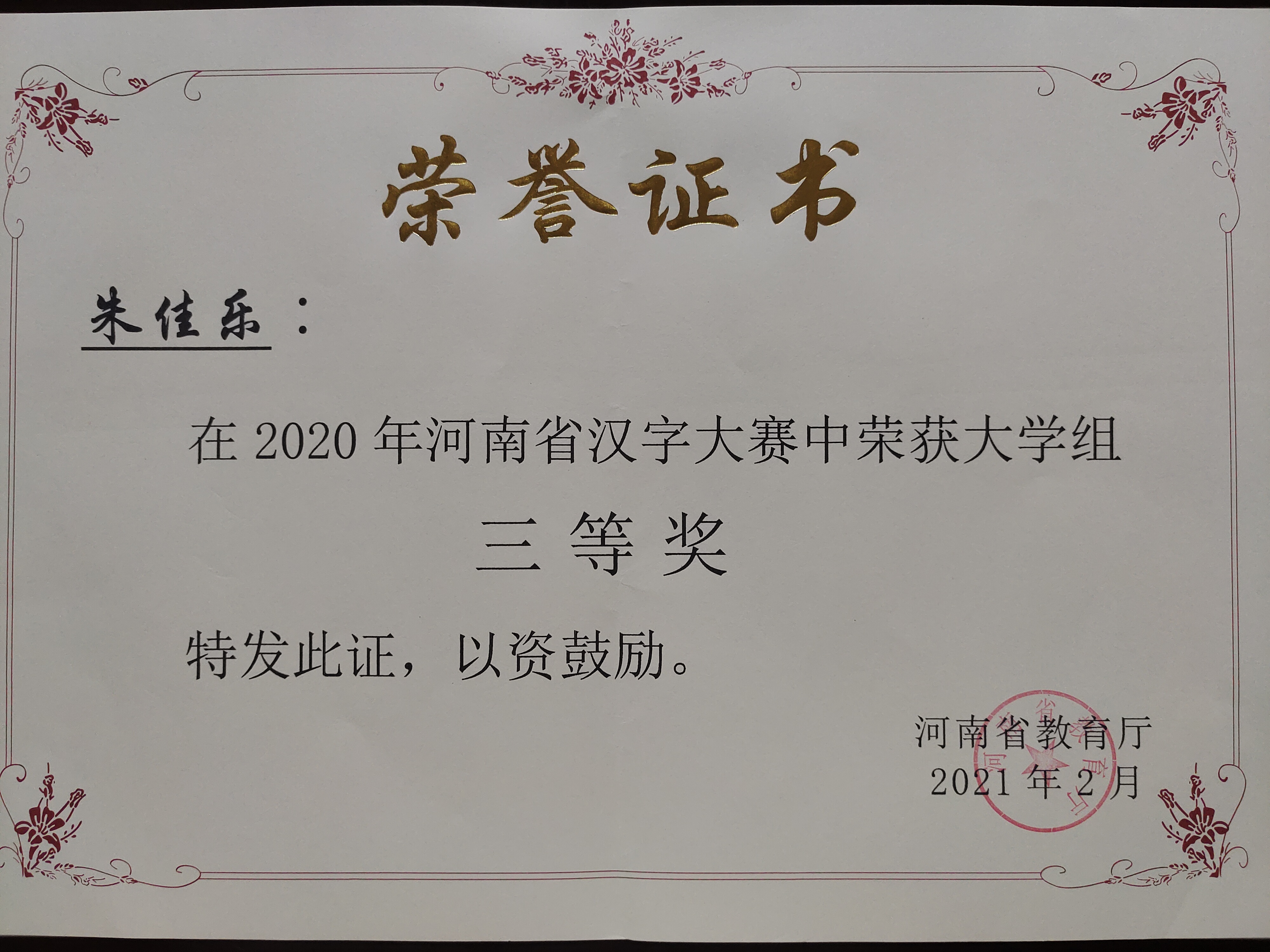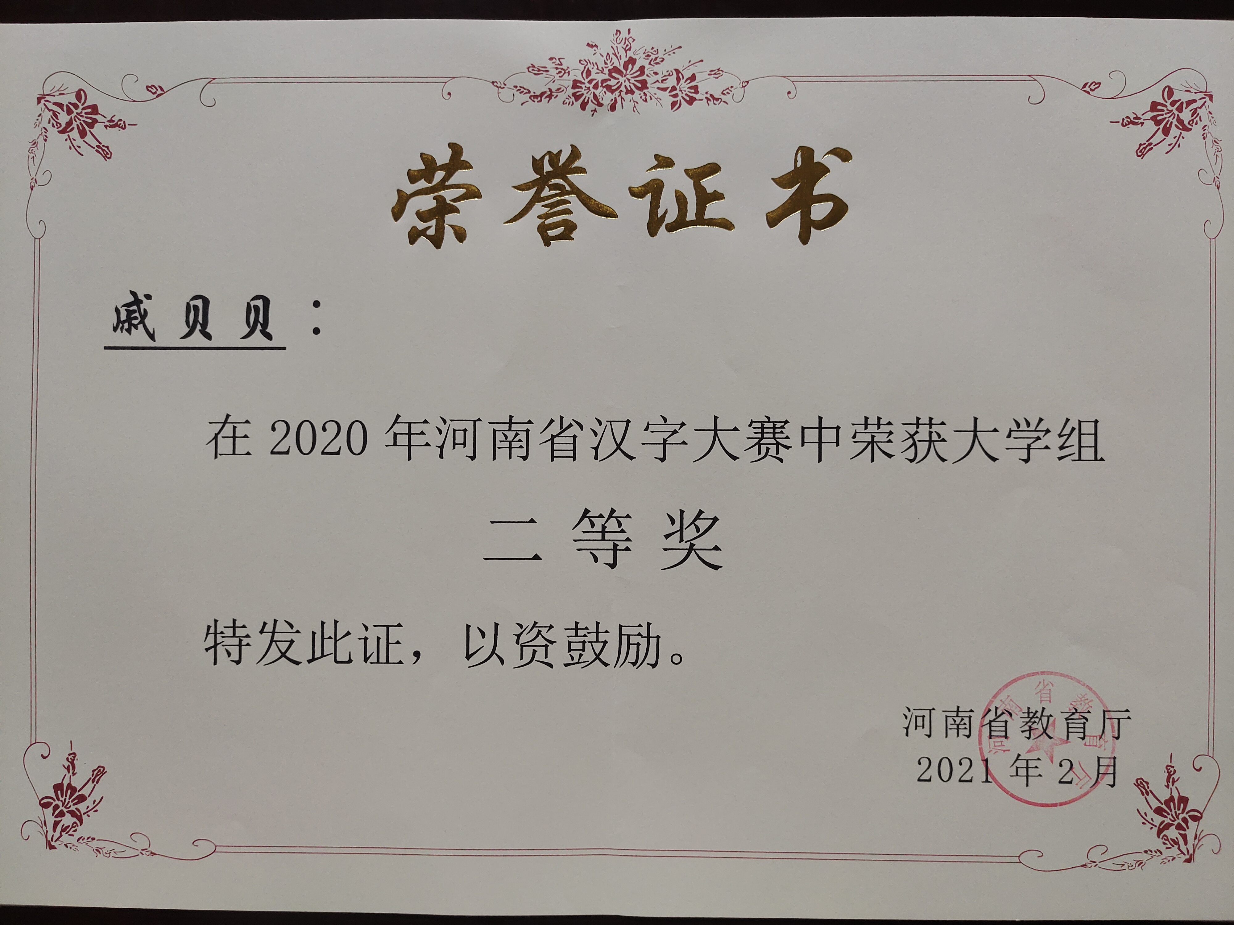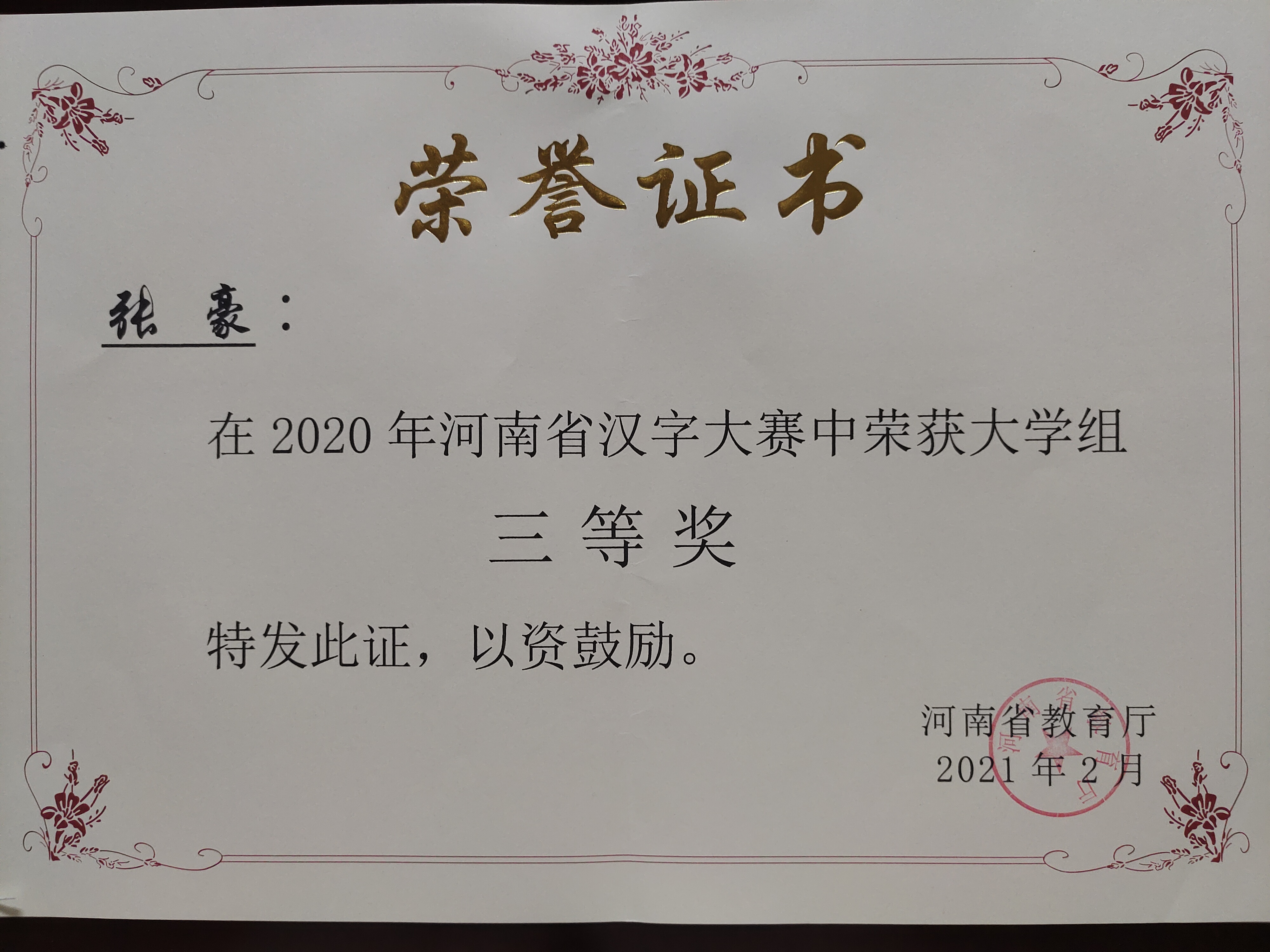 近日,河南省教育厅颁发了2020年河南省汉字大赛获奖荣誉证书,我校参赛的3名同学和指导老师均获奖。其中,戚贝贝同学获得大学组二等奖,张豪和朱佳乐同学获得大学组三等奖,马陕老师获得大学组最佳辅导老师奖。