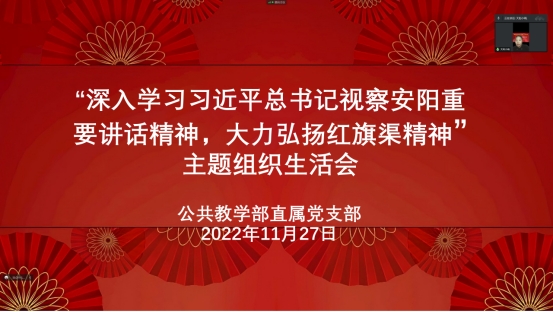 随后,公共教学部直属党支部以“深入学习习近平总书记视察安阳重要讲话精神,大力弘扬红旗渠精神”为主题单独召开专题组织生活会。书记李巍带领大家学习了习近平总书记视察安阳重要讲话精神,号召大家把领会习近平总书记视察安阳重要讲话精神和学习党的二十大精神紧密联系起来,学习“自力更生,艰苦创业,团结协作,无私奉献”的红旗渠精神,将红旗渠精神作为永远激励我们艰苦奋斗、开拓进取的强大精神动力。