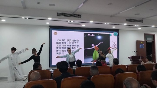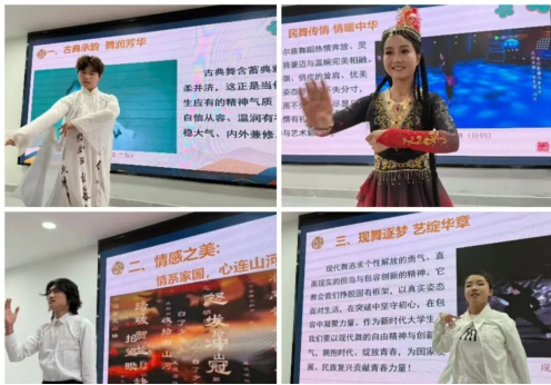 课堂上,各环节层层递进、亮点纷呈:闫璐老师带来的“舞韵传美”环节,古典舞端庄雅致、韵味悠长,民族舞热情灵动、独具风情,现代舞自由奔放、彰显个性,舞者以灵动肢体为载体,将中华舞蹈的多元魅力与深厚文化底蕴展现得淋漓尽致;刘双双老师主讲的“礼韵彰美”环节,立足古今相融、守正创新,将传统礼仪精髓与新时代修身立德要求有机衔接,在潜移默化中传递崇德尚礼、涵养品格的价值理念;刘璞老师开展的“诗韵咏美”环节,采用教师精讲与师生诵读相结合的方式,朗朗书声里,中华诗词的文字之美、情感之深与传承之力扑面而来,让学生在经典诵读中感悟中华文脉的源远流长;李民民老师呈现的“歌韵启美”环节,以乐传情、以歌言志,悠扬歌声中饱含着青年学子的青春抱负与家国情怀,传递出新时代青年的责任与担当。课程在全体师生共唱《我和我的祖国》的激昂歌声中圆满落幕。